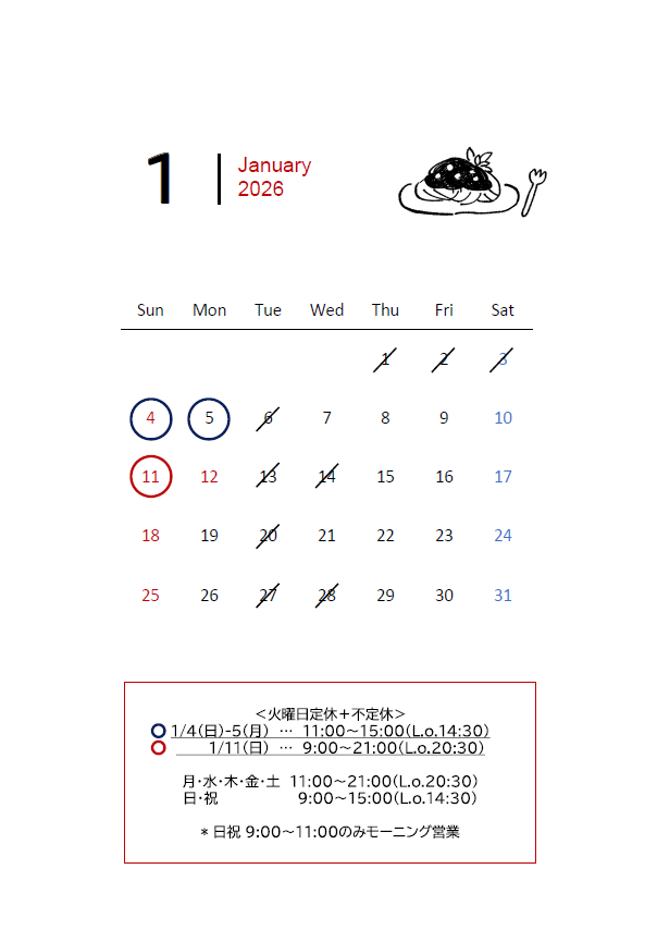 皆さまいつもありがとうございます。2026年1月の営業日時のお知らせです。