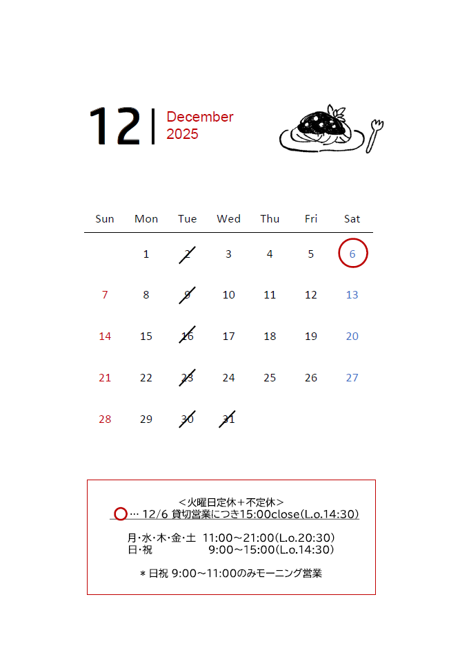 12/6(土)はDinner貸切営業につき。準備等のため15:00closeとなります。来店ご予定のお客様はどうぞご注意くださいませ。