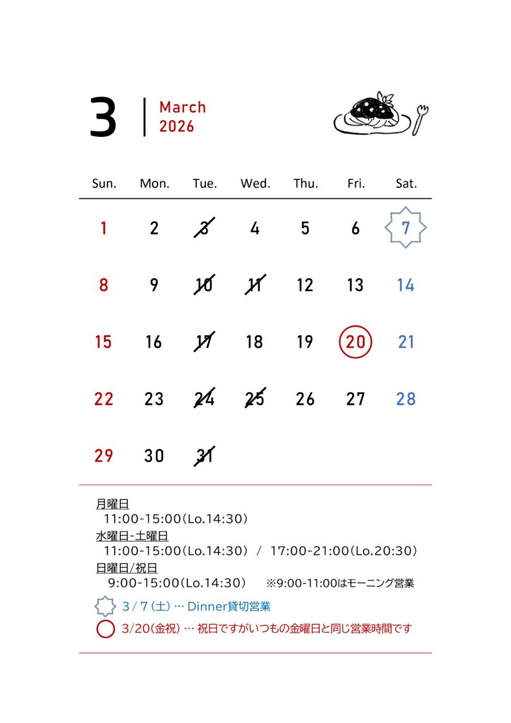 また、3/7(土)Dinnerは貸切営業につき、ご予約以外のお客様はLunchのみのご案内となります。