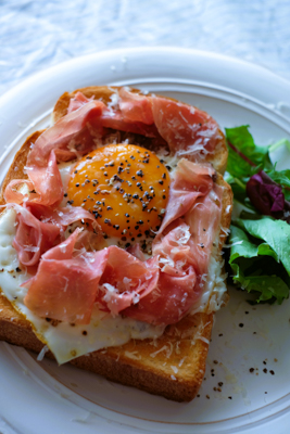 ……とろとろ半熟卵とハモンセラーノのアンチョビトースト・サラダ・ドリンク